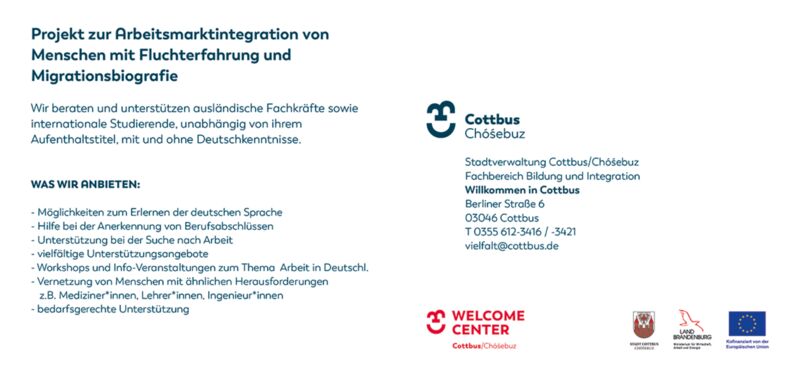 Das Projekt "Willkommen in Cottbus" im Rahmen der Richtlinie "Willkommen in Brandenburg" wird gefördert durch das Ministerium für Wirtschaft, Arbeit und Energie aus Mitteln der Europäischen Union und dem Land Brandenburg und richtet sich an alle Menschen mit Migrationsgeschichte.