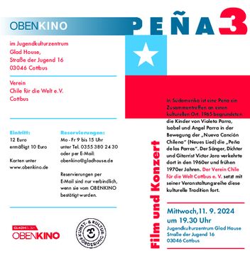 Der Verein Chile für die Welt e.V. veranstaltet eine filmisch-musikalische Reise durch die chilenische Kultur, die am Mittwoch, den 11. September 2024, um 19 Uhr im OBENKINO stattfindet. Diese Veranstaltung präsentiert die Vielfalt der chilenischen Kultur und Geschichte.