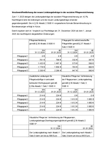 Zum 1.1.2025 stiegen die Leistungsbeträge der sozialen Pflegeversicherung um 4,5 %. Nachfolgend sind die bisherigen und die neuen Leistungsbeträge einander gegenübergestellt. Die in § 30 Absatz 2 SGB XI vorgesehene formale Bekanntmachung im Bundesanzeiger erfolgt in Kürze.