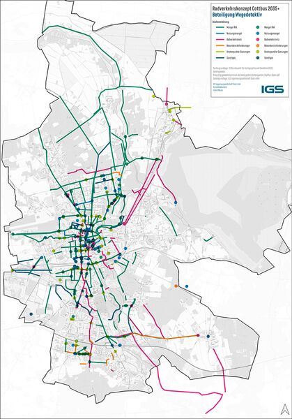 Über eine Online-Beteiligung, den sogenannten Wegedetektiv, konnte die Öffentlichkeit im April 2023 Problemstellen und Verbesserungswünsche direkt auf einer Karte der Stadt verorten. Dabei sind insgesamt 641 Meldungen eingegangen. Die meisten Meldungen (fast 40 %) konnten einem Mangel von anforderungsgerechter Radverkehrsinfrastruktur zugeordnet werden. Der Bedarf für Verbesserung und Ausbau der Infrastruktur wird hier deutlich. Qualität sowie das Vorhandensein von Radverkehrsanlagen sind der Bevölkerung der Stadt Cottbus/Chóśebuz ein wichtiges Anliegen. Die Rückmeldungen wurden geprüft und im Rahmen einer Abwägung in der Maßnahmenerarbeitung berücksichtigt.