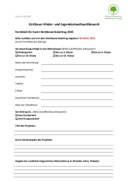 Euer Wettbewerbsbeitrag kann alle Motto getreuen Handlungsfelder umfassen. Einreichen könnt ihr eine Arbeit über ein laufendes oder bereits abgeschlossenes Projekt. Für jedes Projekt ist ein Formblatt ‧ PDF ‧ 77.11 KByte ‧ 28.08.2024 auszufüllen und mit dem Projekt abzugeben. Werden mehrere Projekte von euch eingereicht, ist für jedes Projekt ein separates Formular für die Bewertung auszufüllen. Auch längerfristige Projekte, die bereits einen repräsentativen Zwischenstand aufweisen, können vor dem eigentlichen Projektabschluss als Wettbewerbsbeitrag eingereicht