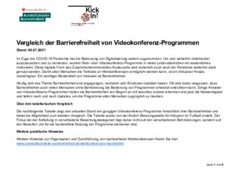 Die Corona-Eindämmungsverordnungen haben das Leben aller Menschen verändert. Vielerorts haben sich neue Formen des Miteinander – insbesondere durch die Nutzung digitaler Angebote – etabliert. Die Tabelle zeigt den aktuellen Stand der gängigen Videokonferenz-Programme hinsichtlich ihrer Barrierefreiheit und bietet die Möglichkeit zum direkten Vergleich. Der Fokus bei der Aufteilung in Bewertungskategorien liegt nicht auf den verschiedenen Behinderungen, sondern auf den Bedarfen, die für die barrierefreie Nutzung der Programme elementar sind.