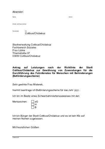 Als freiwillige Leistung der Stadt Cottbus/Chóśebuz werden für Menschen mit Behinderung Beförderungsscheine für Fahrten mit dem Taxi oder mit Fahrdiensten freier Träger gewährt.