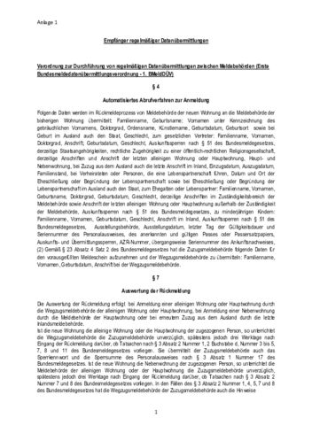 Weitere Empfänger regelmäßiger Datenübermittlungen gemäß 1.u. 2. BMeldDÜV, MeldDÜV sowie Spezialgesetzesind in der Anlage 1 aufgeführt.