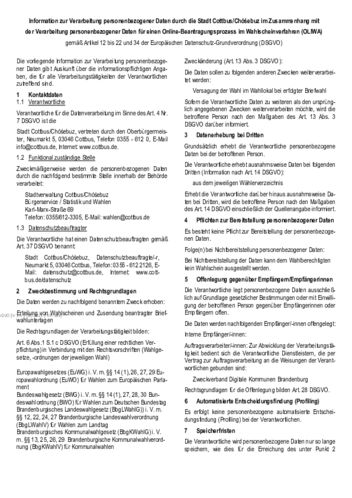 Information zur Verarbeitung personenbezogener Daten durch die Stadt Cottbus/Chóśebuz im Zusammenhang mit der Verarbeitung personenbezogener Daten für einen Online-Beantragungsprozess im Wahlscheinverfahren (OLIWA) gemäß Artikel 12 bis 22 und 34 der Europäischen Datenschutz-Grundverordnung (DSGVO)