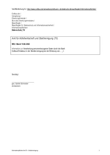 Diese Informationen dienen der Transparenz, wie die Stadt Cottbus/Chóśebuz auf der Grundlage der Straßenreinigungssatzung mit personenbezogenen Daten von Privatpersonen und Unternehmen umgeht.