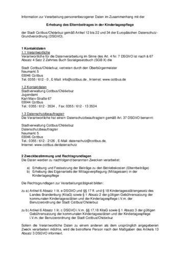 Es besteht die Pflicht der Angabe der vertraglich benannten Daten bzw. die für die Zweckerfüllung erforderlichen Daten gemäß § 97 a Sozialgesetzbuch Achtes Buch – Kinder- und Jugendhilfe (SGB VIII). Kommt die betroffene Person der Auskunftspflicht nicht nach wird folglich der Höchstbeitrag laut Gebührensatzung der kommunalen Kindertagesstätten und der Kindertagespflege der Stadt Cottbus festgesetzt.