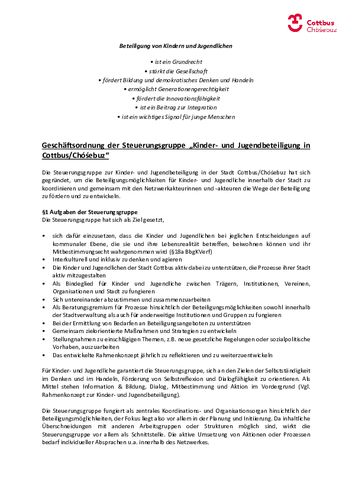 Geschäftsordnung der Steuerungsgruppe „Kinder- und Jugendbeteiligung inCottbus/Chóśebuz ‧ PDF ‧ 96.10 KByte ‧ 01.06.2021