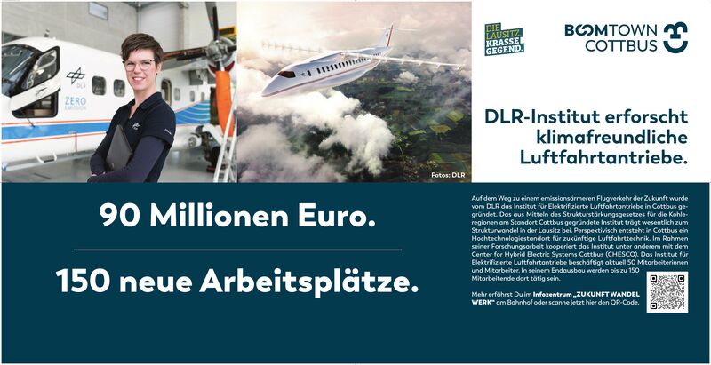 Auf dem Weg zu einem emissionsärmeren Flugverkehr der Zukunft wurde vom DLR das Institut für Elektrifizierte Luftfahrtantriebe in Cottbus gegründet. Das aus Mitteln des Strukturstärkungsgesetzes für die Kohleregionen am Standort Cottbus gegründete Institut trägt wesentlich zum Strukturwandel in der Lausitz bei. Perspektivisch entsteht in Cottbus ein Hochtechnologiestandort für zukünftige Luftfahrttechnik. Im Rahmen seiner Forschungsarbeit kooperiert das Institut unter anderem mit dem Center for Hybrid Electric Systems Cottbus (CHESCO). Das Institut für Elektrifizierte Luftfahrtantriebe beschäftigt aktuell 50 Mitarbeiterinnen und Mitarbeiter. In seinem Endausbau werden bis zu 150 Mitarbeitende dort tätig sein.
