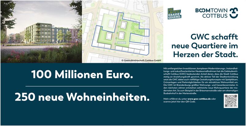 Mit umfangreichen Investitionen, komplexen Modernisierungs-, Instandhaltungs- und zukunftsorientierten Neubaumaßnahmen hat die Gebäudewirtschaft Cottbus GmbH (GWC)bedeutenden Anteil daran, dass die Stadt Cottbus stetig an Anziehungskraft gewinnt. Als aktiver Teil der Stadtentwicklung setzt die GWC dabei auch vielfältige Gestaltungskonzepte mit Spielplätzen, Grünanlagen und Parkmöglichkeiten für ein attraktives Wohnumfeld um. Die GWC ist Brandenburgs größter Wohnungs- und Gewerbevermieter. In den nächsten Jahren entstehen zahlreiche neue Wohnquartiere der modernsten Art. So zum Beispiel in der Briesmannstraße oder am ehemaligen Busbahnhof in der Marienstraße.