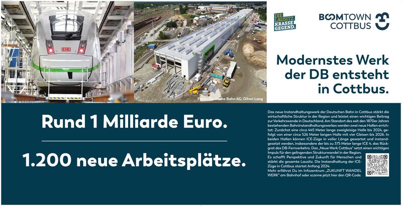 Das neue Instandhaltungswerk der Deutschen Bahn in Cottbus stärkt die wirtschaftliche Struktur in der Region und leistet einen wichtigen Beitrag zur Verkehrswende in Deutschland. Am Standort des seit den 1870er Jahren bestehenden Bahninstandhaltungswerkes werden zwei neue Hallen errichtet: Zunächst eine circa 445 Meter lange zweigleisige Halle bis 2024, gefolgt von einer circa 526 Meter langen Halle mit vier Gleisen bis 2026. In beiden Hallen können ICE-Züge in voller Länge gewartet und instandgesetzt werden, insbesondere der bis zu 375 Meter lange ICE 4, das Rückgrat des DB-Fernverkehrs. Das „Neue Werk Cottbus“ setzt einen wichtigen Impuls für den gelingenden Strukturwandel in der Region. Es schafft Perspektive und Zukunft für Menschen und stärkt die gesamte Lausitz. Die Instandhaltung der ICE-Züge in Cottbus startet Anfang 2024.