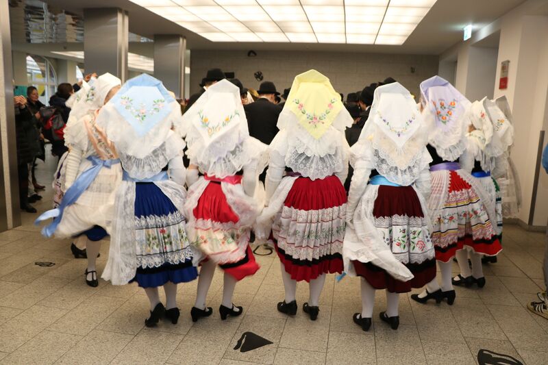 Es werden die Paare für den Umzug zusammengestellt. Die Mädchen haben alle ihre festlichen Tanztrachten mit den gestickten Seidenhalstüchern und den weißen Spitzenschürzen angelegt. Vollständig ist die Tracht aber erst mit der "lapa", der kunstvoll gebundenen Haube. Leider wird diese Haube nicht mehr in allen Dörfern getragen.